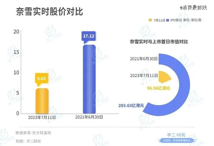 今年3月份,奈雪公布2022年年报,年报公布后的*交易日,奈雪股价上涨16.94%,可惜好景维持不长,进入7月份,奈雪的股价一度跌至5.63港元/股,约折合人民币5.18元,对应市值96.56亿港元,约折合人民币88.85亿元;对比IPO首日,其市值下跌近200亿港元。