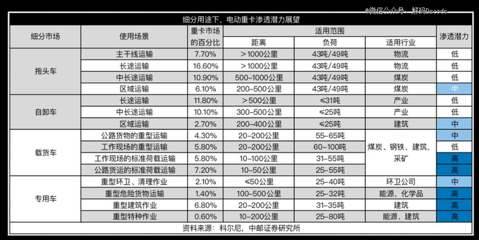 单程距离长、载重高、对运输效率要求较高的中长途运输,目前换电重卡的渗透潜力较低,其制约因素主要是换电站基础设施建设薄弱,尚不具备大规模应用的条件。