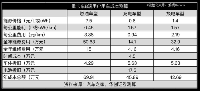 华创证券测算,假设每年总里程数为15万公里,充电电价0.6元/kWh,换电电价1.4元/kWh,柴油价7.5元/升。换电重卡车比充电重卡车每年可节约成本3.2万元,比燃油重卡节约27.22万元之多。