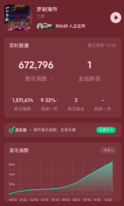 自发行以来,《罗刹海市》连续霸占了QQ音乐新歌榜、热歌榜、流行指数榜等一系列榜单榜首,数十万人同时在线收听,抖音话题累计播放量超过45亿,一举成为2023年下半年第一首全民热议的现象级歌曲。