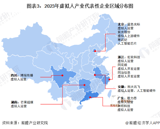 从代表性上市企业分布情况来看,我国虚拟人代表企业分布在广东、浙江等东部沿海省份,同时四川、湖南、安徽等内陆省份也有企业布局,其中浙江省与北京市的虚拟人产业代表性上市企业较多。