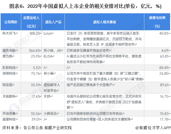 从我国布局虚拟人的相关上市公司营收情况来看,截至2022年底,科大讯飞、蓝色光标的虚拟人业务收入在100亿元以上。2022年,虹软科技的销售毛利率最高,达88.49%。
