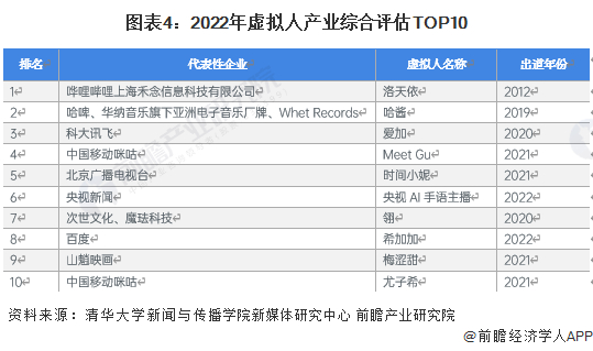 目前,我国虚拟人行业整体参与企业较多,行业龙头地位显著。根据清华大学新闻与传播学院新媒体研究中心制作的《2022虚拟数字人综合评估指数报告》,2022年我国综合指数排名前十的虚拟数字人分别为洛天依、哈酱、爱加、Meet Gu、时间小妮、央视AI手语主播、翎、希加加、梅涩甜、尤子希,具体信息如下。