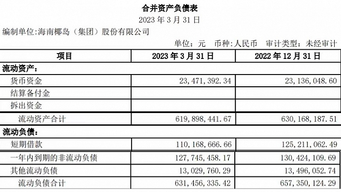 根据2023年一季度报数据,期内海南椰岛拥有货币资金2347万元,短期借款1.10亿元,流动资产约6.20亿元,流动负债约6.31亿元,目前已有资不抵债的风险。