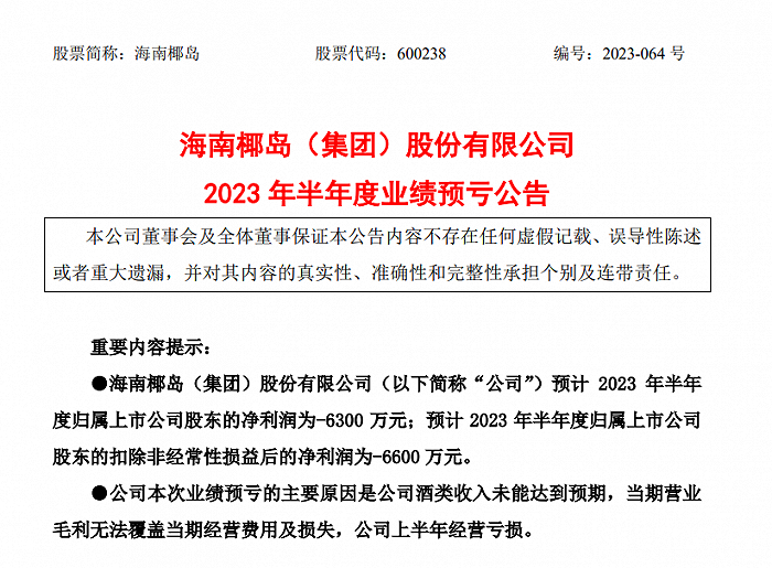 在迎来自己的新股东后,7月15日,海南椰岛发布了2023年半年对业绩亏损预告,预计2023年上半年归属净利润亏损6300万元。当年在保健酒领域说一不二的“老大哥”,如今的命运让人慨叹。