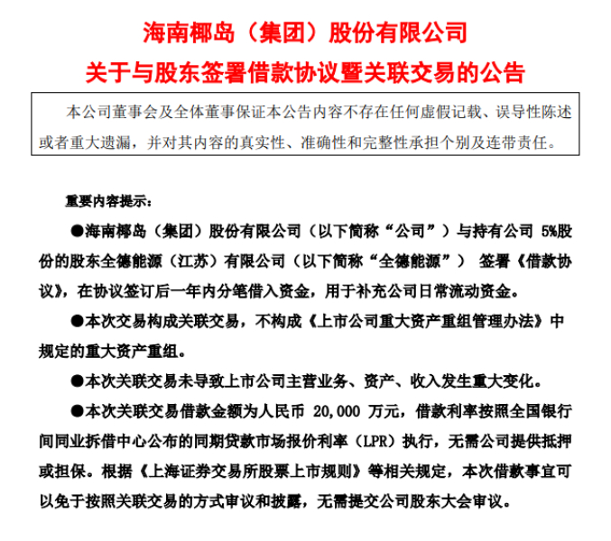 海南椰岛公告显示,为了补充公司流动资金,满足日常经营发展的资金需求,公司拟与全德能源签署借款协议。全德能源在协议签署后一年内,根据海南椰岛资金需求,向海南椰岛提供总额度2亿元借款,借款期限1年。