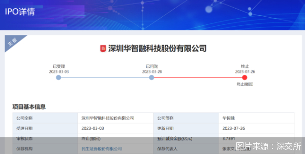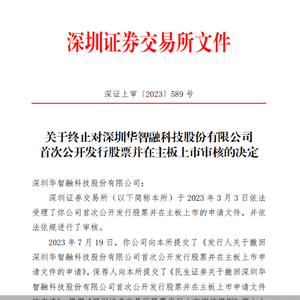 2023年7月19日,华智融向深交所提交了《发行人关于撤回深圳华智融科技股份有限公司首次公开发行股票并在主板上市申请文件的申请》,上市保荐人也同步提交了《民生证券关于撤回深圳华智融科技股份有限公司首次公开发行股票并在主板上市申请文件的申请》。7月26日,深交所正式公布终止华智融上市的决定,至此,华智融再次未能上市成功。