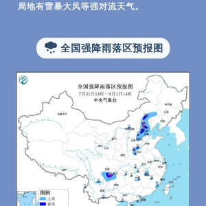 预计,7月31日14时至8月1日14时,内蒙古东南部、河北大部、北京、天津、四川盆地东南部、贵州西北部、云南东北部等地部分地区有大到暴雨,其中,河北北部沿山、北京北部和西南部、四川盆地东南部等地部分地区有大暴雨(100~150毫米)。上述部分地区伴有短时强降水(最大小时降雨量30~60毫米,局地可超过70毫米),局地有雷暴大风等强对流天气。