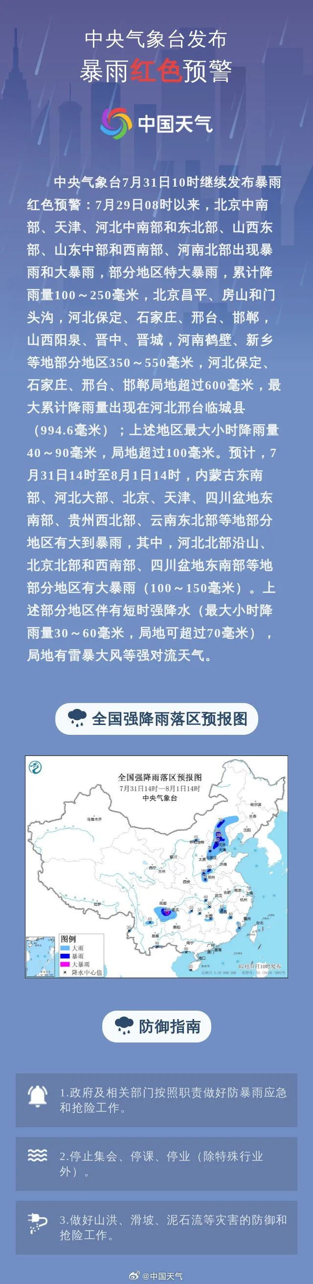中央气象台7月31日10时继续发布暴雨红色预警:7月29日08时以来,北京中南部、天津、河北中南部和东北部、山西东部、山东中部和西南部、河南北部出现暴雨和大暴雨,部分地区特大暴雨,累计降雨量100~250毫米,北京昌平、房山和门头沟,河北保定、石家庄、邢台、邯郸,山西阳泉、晋中、晋城,河南鹤壁、新乡等地部分地区350~550毫米,河北保定、石家庄、邢台、邯郸局地超过600毫米,最大累计降雨量出现在河北邢台临城县(994.6毫米);上述地区最大小时降雨量40~90毫米,局地超过100毫米。