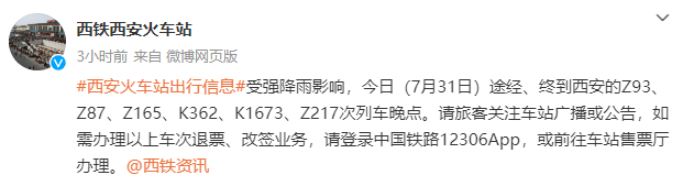 据西铁西安火车站官微消息,受强降雨影响,今日(7月31日)途经、终到西安的Z93、Z87、Z165、K362、K1673、Z217次列车晚点。请旅客关注车站广播或公告,如需办理以上车次退票、改签业务,请登录中国铁路12306App,或前往车站售票厅办理。