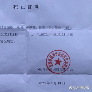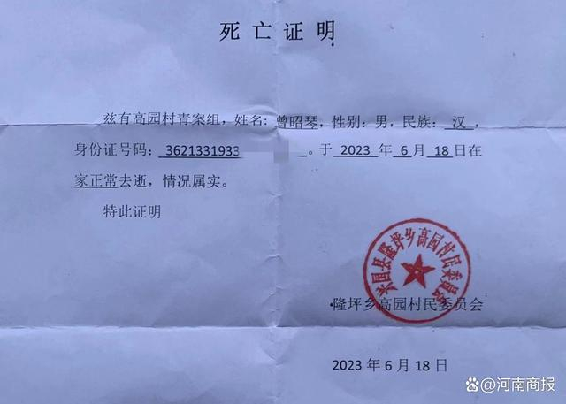 当天下午4点左右,家属将老人的遗体运回家中,并陆续通知在外地的儿孙辈赶回老家。当天下午6点左右,家属前往村委会给老人办理《死亡证明》,家属说明情况后,村干部刘某福开具了一份《死亡证明》,并盖上村委会公章。《死亡证明》上写着,曾昭琴于2023年6月18日“在家正常去逝,情况属实”。家属拿到《死亡证明》后,村干部又通过熟人传话,催促尽快将老人的遗体火化。