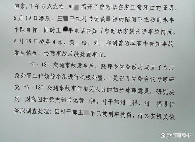 经查,6月18日下午3点10分,高园村村干部王某平驾驶乡干部邱某民的车子,行至高园村三江口交叉路口时撞到曾昭琴。约20秒后,黄某(高园村村支书黄某福之子)驾驶一辆白色轿车经过事故现场,车上还坐有4名乡干部陈某辉、邱某民、王某艳、吕某,其中黄某、邱某民下车查看情况,1分钟后,高园村村干部刘某福也骑摩托车到达现场。