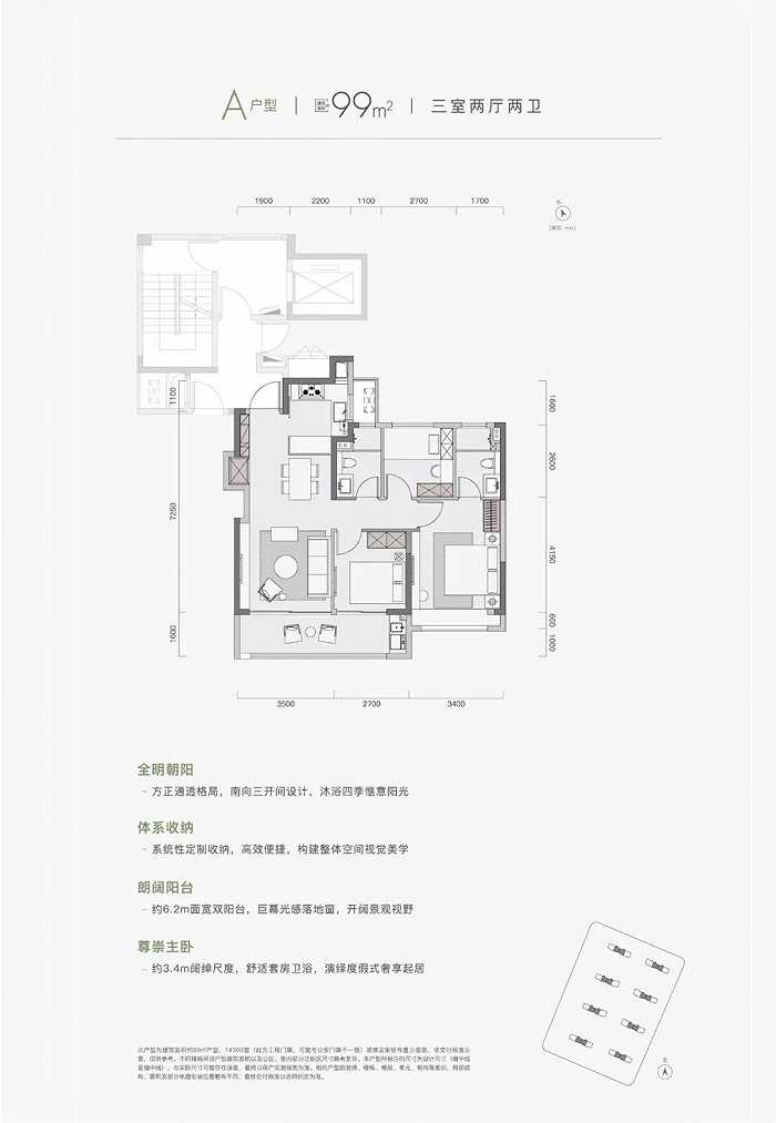 据悉,本次朗拾推出的大量99㎡房源去化最快,吸引了很多年轻客户。现场有很多都是成对来选房的,有不少新婚夫妻或男女朋友来购置房产,并且工作地点大多来自软件谷、河西新城,看重雨核朗拾的位置以及户型面积。首开户型如下:建面约99㎡三室两厅两卫是该项目的起步户型,三开间朝南、约6.2米双阳台设计,约3.4米宽奢横厅,空间感和尺度感十足。