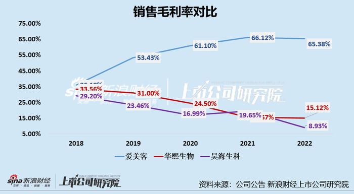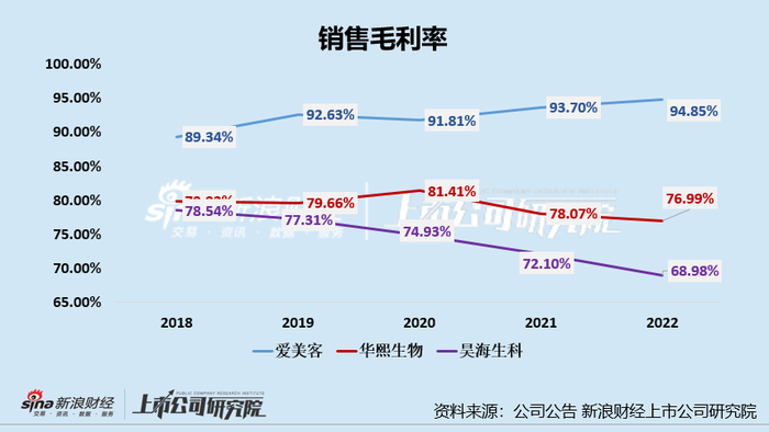 除了业绩增速垫底外,昊海生科的盈利能力指标销售毛利率、销售净利率表现均不及爱美客和昊海生科。从销售毛利率的角度看,昊海生科的销售毛利率连续5年下降,从2018年的78.54%下降至68.98%,且明显低于爱美客(2022年毛利率为94.85%)和华熙生物(2022年毛利率为76.99%)。