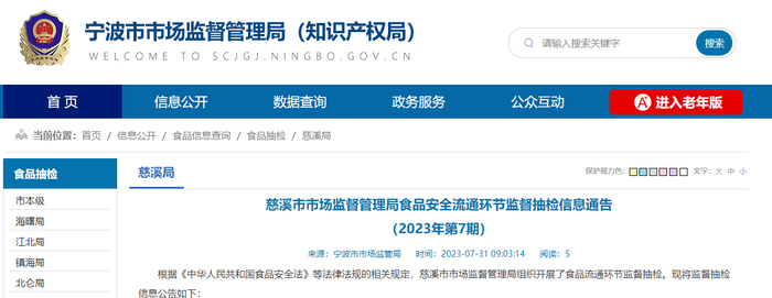 中国质量新闻网讯 近日,浙江省慈溪市市场监督管理局发布食品安全流通环节监督抽检信息(2023年第7期)。本期抽检流通环节食品共383批次,合格367批次、不合格16批次。