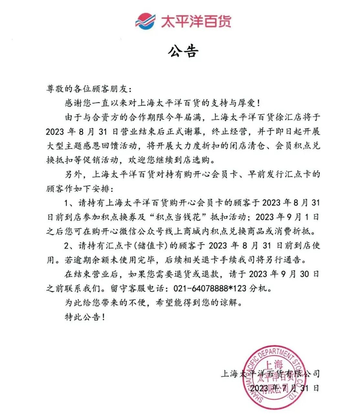 7月31日上午,开业即将满30年的上海太平洋百货徐汇店发出公告,“由于与合资方的合作期限今年届满,上海太平洋百货徐汇店将于2023年8月31日营业结束后正式谢幕,终止经营。”同时,商场已同步开展大力度折扣的闭店清仓、会员积点兑换抵扣等促销活动。