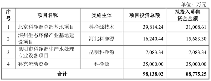 募投项目计划所需资金为8.88亿元,将用于北京科净源总部基地项目、深圳生态环保产业基地建设项目、昆明市科净源生产水处理专业设备项目,以及作为补偿流动资金。具体来看:
