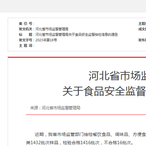 河北省市场监管局抽检食品1432批次 不合格16批次