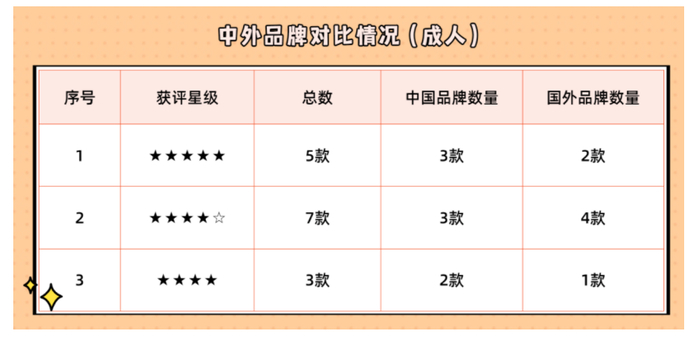 在5款五星样品中,中国品牌有3款,均价为210.28元;国外品牌有2款,均价为386.36元,相比而言,消费者在五星产品的选择上,中国品牌样品的性价比更高。