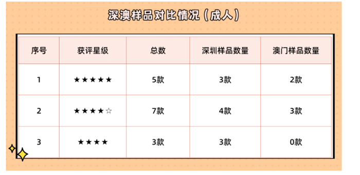 15款成人防晒衣样品中,深圳购买的10款,澳门购买的5款。在5款五星样品中,澳门购买的有2款,深圳购买的有3款,两地消费者可按需消费。