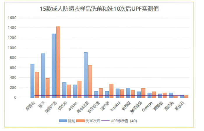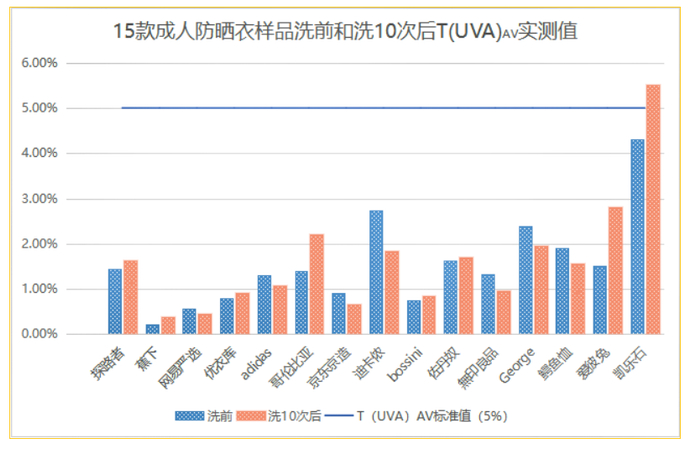 15款样品的洗前和洗3次后的防紫外线性能,均符合相关标准要求,13款样品经10次洗涤后防紫外线性能仍保持较好,其中CICICURE(网易严选)、哥伦比亚、探路者品牌样品,防紫外线性能表现优秀。