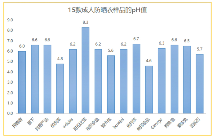 15款成人防晒衣样品pH值在4.6~8.3之间,均符合相关标准要求。