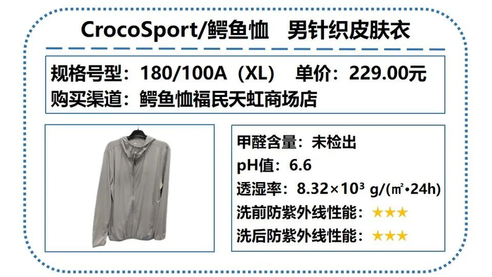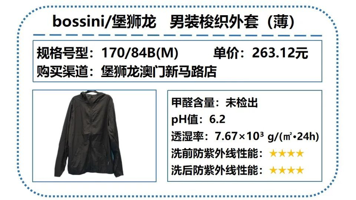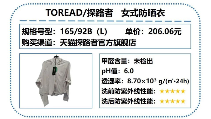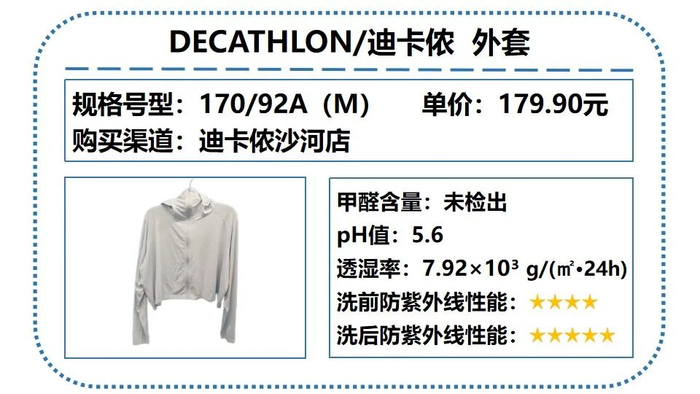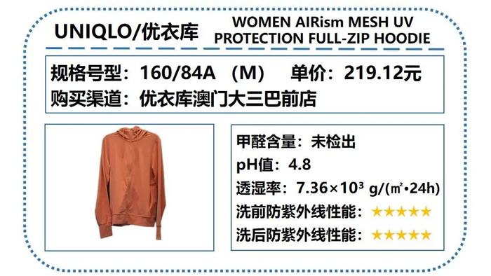 15款成人防晒衣样品中,有5款样品综合表现卓越,获评五星,分别是探路者、蕉下、CICICURE(网易严选)、优衣库、adidas品牌样品。