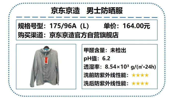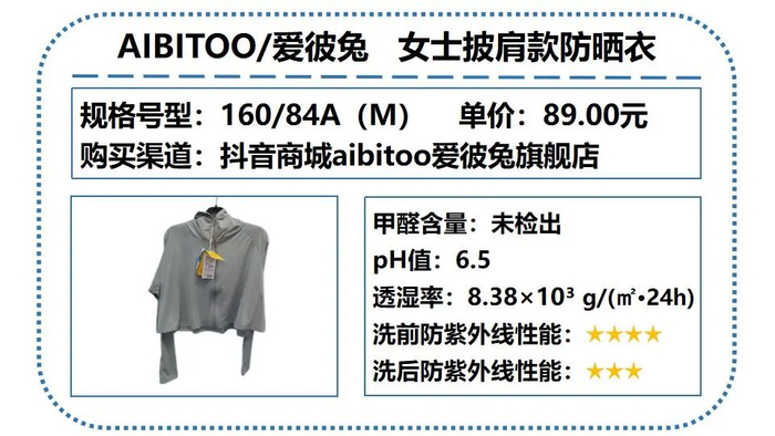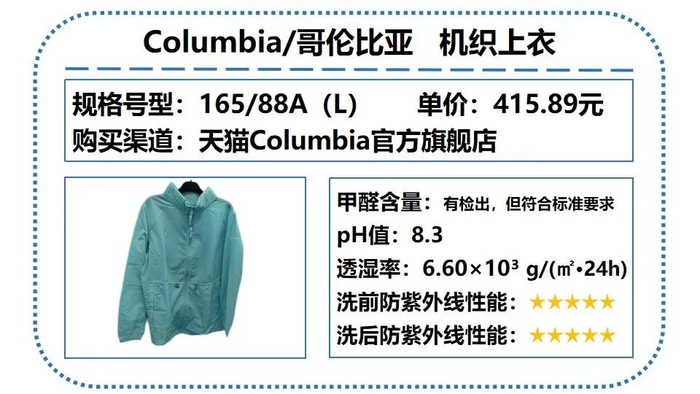 15款防晒衣样品的甲醛含量检测结果均符合相关标准要求,其中14款样品未检出,哥伦比亚品牌样品有检出甲醛,但在标准规定的范围之内。