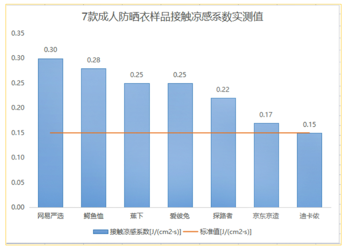 7款样品的接触瞬间凉感性能均符合该标准要求,其中,CICICURE(网易严选)、鳄鱼恤、蕉下、爱彼兔品牌样品的接触凉感系数为0.25J/(cm²·s)及以上,表现优秀。