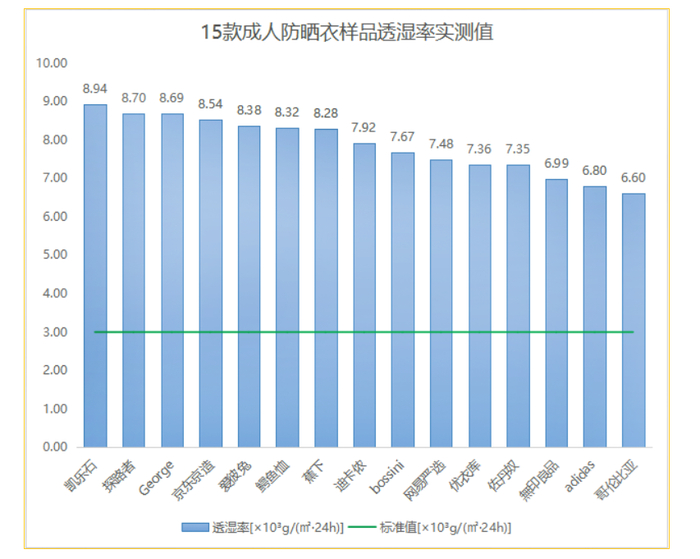 15款样品的透湿率均达到标准规定值的2倍以上,透湿性能表现不俗。