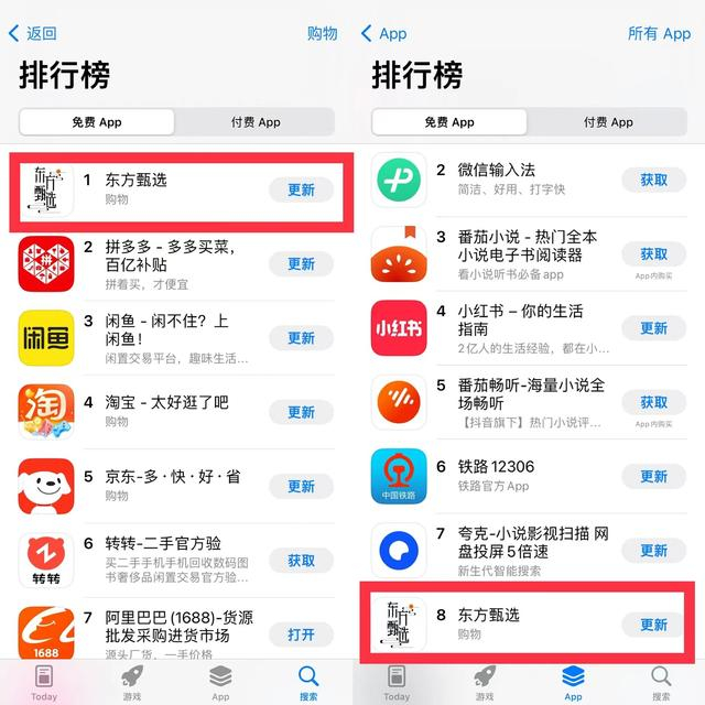 停播当天,东方甄选高调宣布转场自营App开播,并连续三天8.5折促销。根据东方甄选披露数据,自营产品开启促销4天内,App实现销售额超过1.1亿元。7月28日,东方甄选App刷新下载量纪录,登上苹果应用商店购物榜第1位、免费榜总榜第8位。