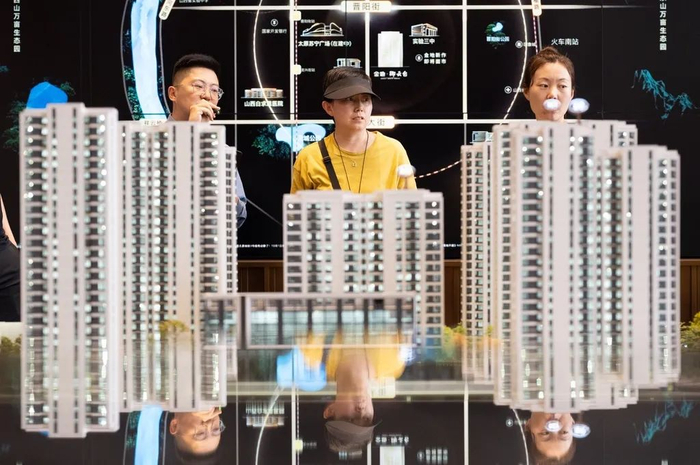 2023年7月14日,山西省太原市,置业顾问为民众推荐商品房户型。7月政治局会议首次明确提出,适应中国房地产市场供求关系发生重大变化的新形势,适时调整优化房地产政策。/IC Photo