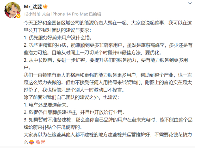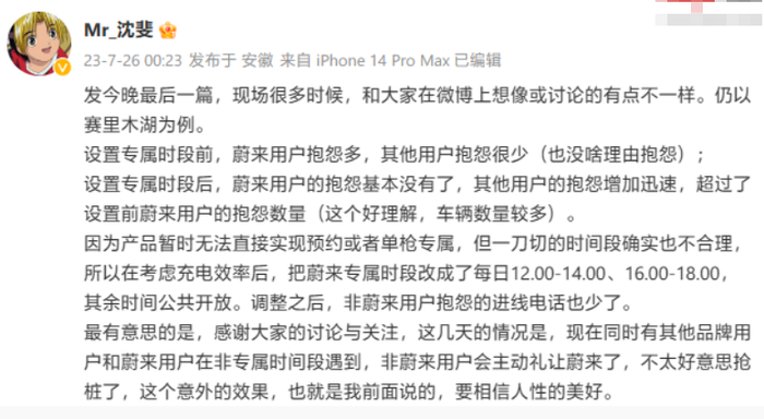 7月23日凌晨,蔚来汽车副总裁沈斐在微博上回应: