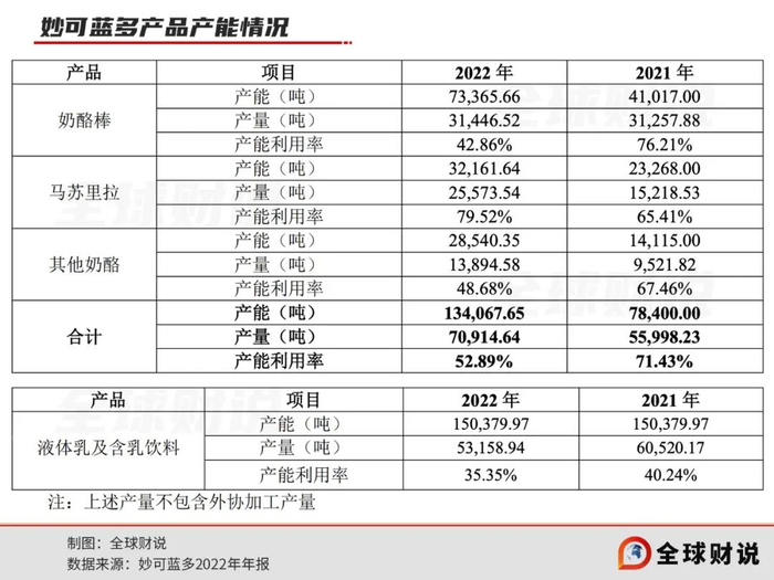 更重要的是,通过财报披露表格便可以看出,其实早在2021年,妙可蓝多的产能利用率便处于不饱和状态。