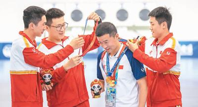 由夏琦、刘帅、段志成组成的中国队获得男子25米手枪速射团体项目冠军。他们为教练戴上奖牌,表示感谢。新华社发
