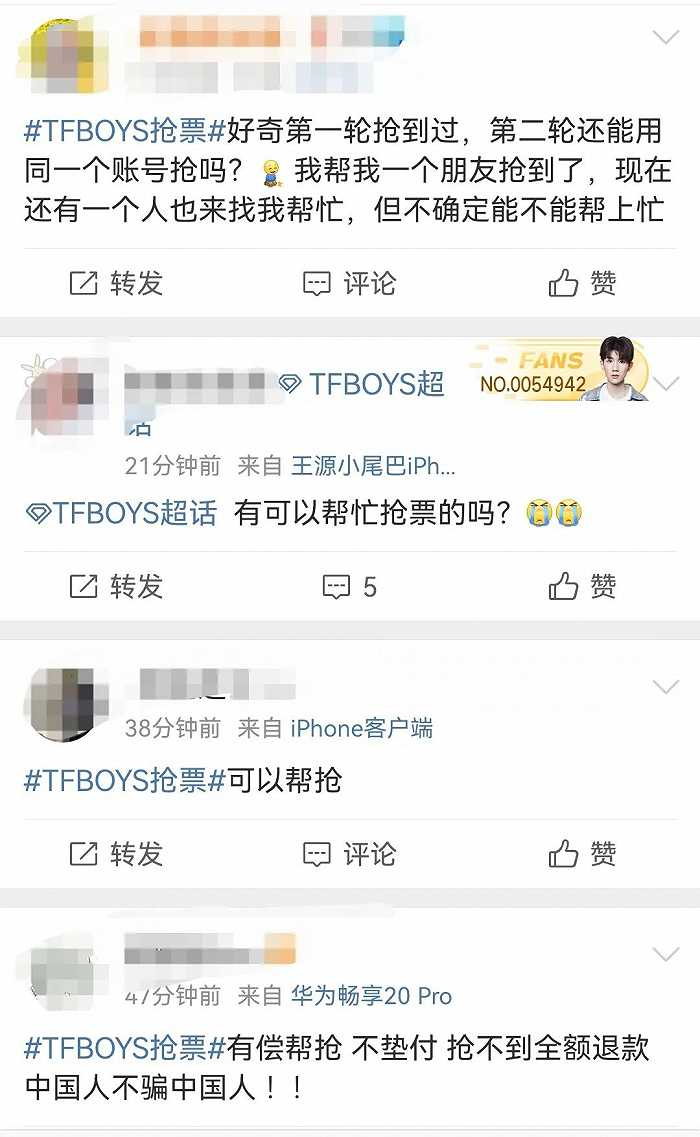 在社交平台上,大量TFBOYS将寻找靠谱代抢作为抢票任务的核心,且并不局限于“专业”黄牛,不少粉丝、路人也纷纷晒出自己的抢票战绩,变相成为了另一代抢群体。