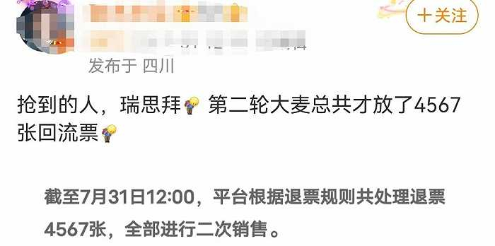 7月31日,TFBOYS十周年西安演唱会迎来第二次大规模抢票日。根据大麦网显示,平台根据退票规则共处理第一轮退票4567张,而这不足5千张的回流票也已投入二轮销售,但即便有所增加,二轮售票也同样在一秒内便显示售罄。