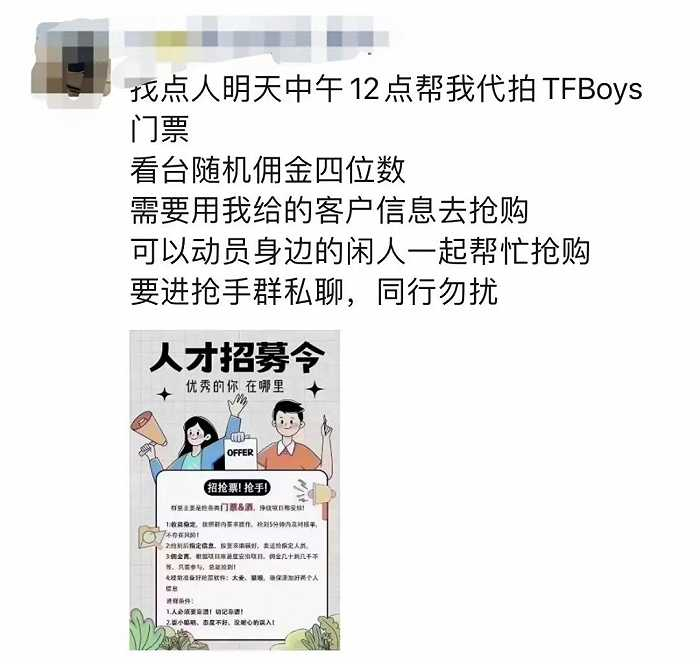 在音乐先声收到的一份“人才招募令”中便显示,这些“人工抢手”以群为划分,并由上级黄牛向其提供客户信息,按照规定步骤完成代抢便能够收到几十到几千不等的抢手佣金。