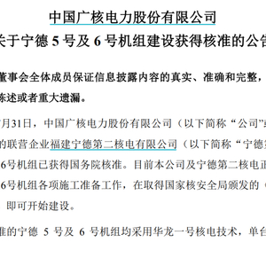中国广核发布公告,本次核准的宁德5号及6号机组均采用华龙一号核电技术,单台机组容量为1210MW。华龙一号是由中国核电和中国广核共同研发、具有完全自主知识产权的三代压水堆核电技术,是中国核电机组发展的主力堆型。此外,本次核准的山东石岛湾核电厂扩建一期工程项目1、2号机组也将采用华龙一号技术。