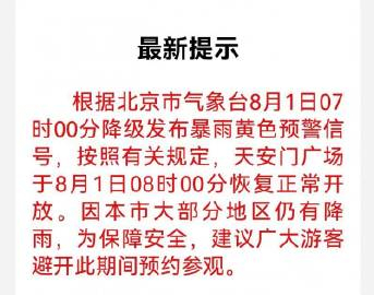 天安门广场预约参观平台最新提示显示,根据北京市气象台8月1日7时00分降级发布暴雨黄色预警信号,按照有关规定,天安门广场于8月1日8时00分恢复正常开放。因北京市大部分地区仍有降雨,为保障安全,建议广大游客避开此期间预约参观。