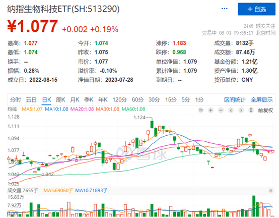 主流ETF方面,8月1日,纳指生物科技ETF(513290)冲击两连涨,现涨0.19%,向上探至20日均线附近!