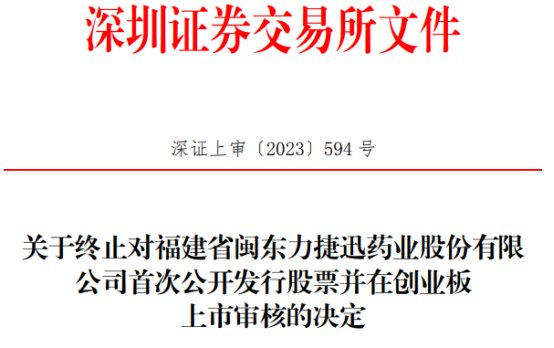 深交所于2022年6月28日依法受理了力捷迅首次公开发行股票并在创业板上市的申请文件,并依法依规进行了审核。2023年7月23日,力捷迅向深交所提交了《福建省闽东力捷迅药业股份有限公司关于撤回首次公开发行股票并在创业板上市申请文件的申请》,保荐人向深交所提交了《民生证券股份有限公司关于撤回福建省闽东力捷迅药业股份有限公司首次公开发行股票并在创业板上市申请文件的申请》。根据《深圳证券交易所股票发行上市审核规则》第六十二条的有关规定,深交所决定终止对力捷迅首次公开发行股票并在创业板上市的审核。