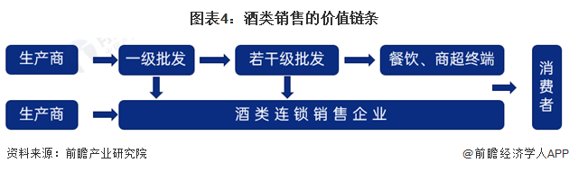 酒类流通行业的价值链条包括其上游生产商、中间环节即酒类流通企业、下游环节即消费者三大主体。酒类生产商在酒类流通行业处于优势地位,因此在行业价值链中生产商所占利润较高;酒类中间环节所占的利润约占行业总利润的比例为20%-30%,但由于目前我国酒类流通行业批发、零售环节较多,导致各个环节之间利润层层分割,因此每一级批发商、零售商所占利润相对较低。