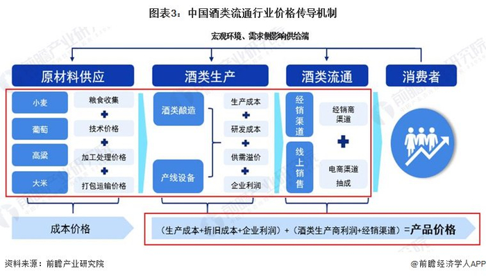 从中国酒类流通价格传导机制的角度来看,上游包括原材料的供应和酒类生产环节,价格传导经过原材料运输、酒类生产和生产线建造成本等,酒类流通环节主要包含经销渠道和线上销售两种,最终确定产品价格传输到消费者。