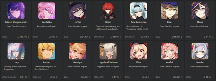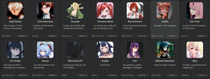 游戏动漫类角色占绝对的优势地位,似乎说明玩Character.ai的主要是二次元爱好者。