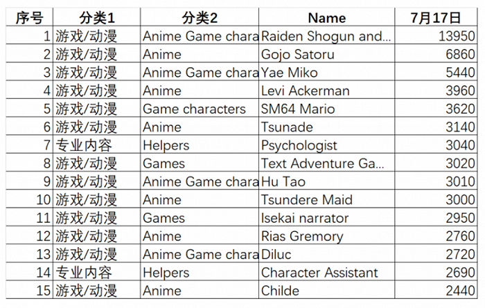 排名前十五的角色如表所示,可以看见游戏动漫类角色依旧占主导。除此之外还有两个角色来自专业内容类,除了客服Character Assistant,还有一位是提供心理咨询服务的Psychologist,排名第7。