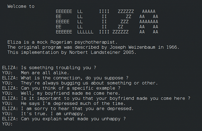该程序会像心理学家一样与用户交谈。它的大部分回答都是“你为什么会有这种感觉?”而不是任何类型的复杂交互。
