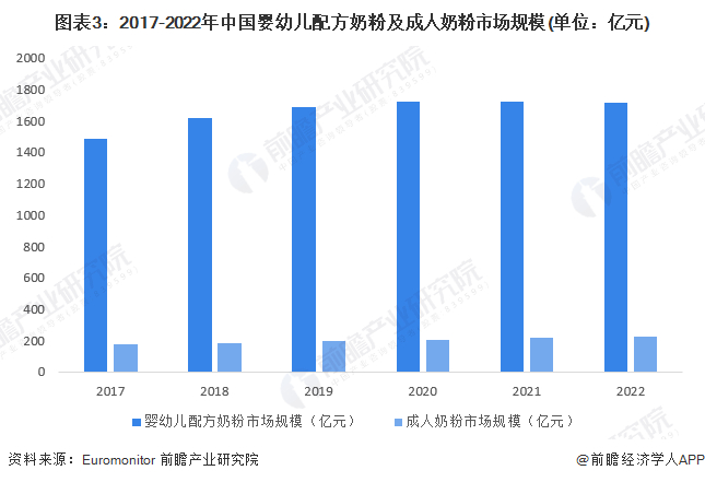 据Euromonitor数据,2017-2022,中国婴幼儿配方奶粉及成人奶粉市场规模整体趋势较为平稳;其中,中国婴幼儿配方奶粉整体市场规呈先上升后下降趋势,2022年,中国婴幼儿配方奶粉市场规模相较于2021年略有下降;中国成人奶粉市场规模整体呈现逐年增长趋势。