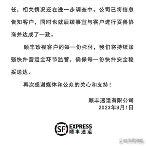据顺丰集团官博,8月1日,顺丰速运有限公司通报劳力士手表遗失事件进展:快件单号SF1159XXXXX1637从吉林省延吉市寄至广东省广州市,客户签收快件后反馈内件遗失。经相关部门调查,初步判定系外部人员所为,目前手表已被找回,非我司收派件快递员责任,相关情况还在进一步调查中。公司已将信息告知客户,同时也就后续事宜与客户进行妥善协商并达成了一致。