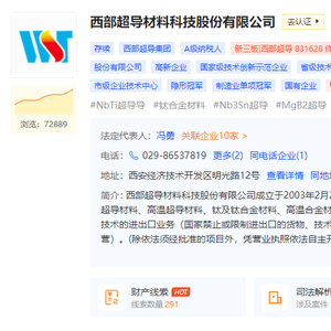 根据启信宝数据显示,西部超导材料科技股份有限公司成立于2003年,注册地在西安经济技术开发区,现有创新产业园区四个、下属控股公司六家,是国内领先、国际先进的超导材料、超导磁体、高端钛合金、高性能高温合金创新研发生产企业。